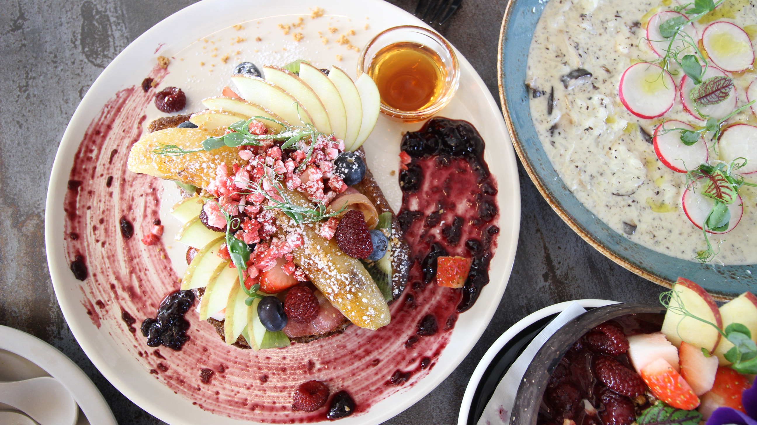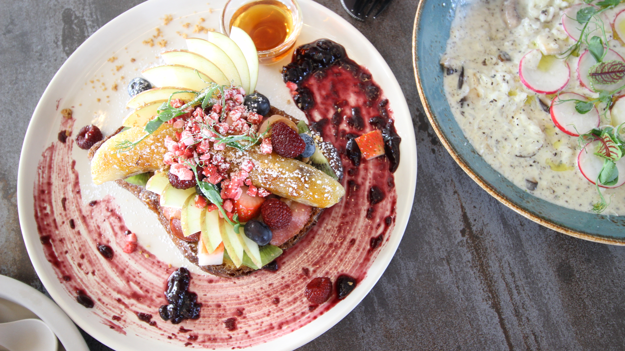 프렌치토스트 위에 각종 과일토핑과 소세지,베이컨까지 푸짐하게 올려져 있습니다.