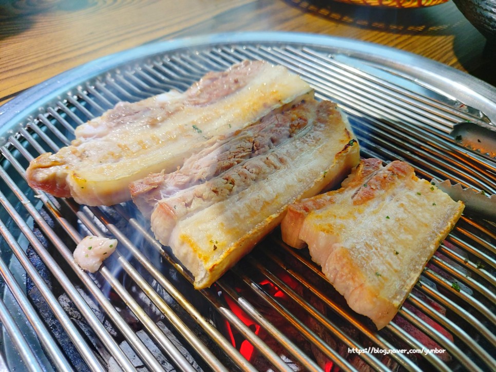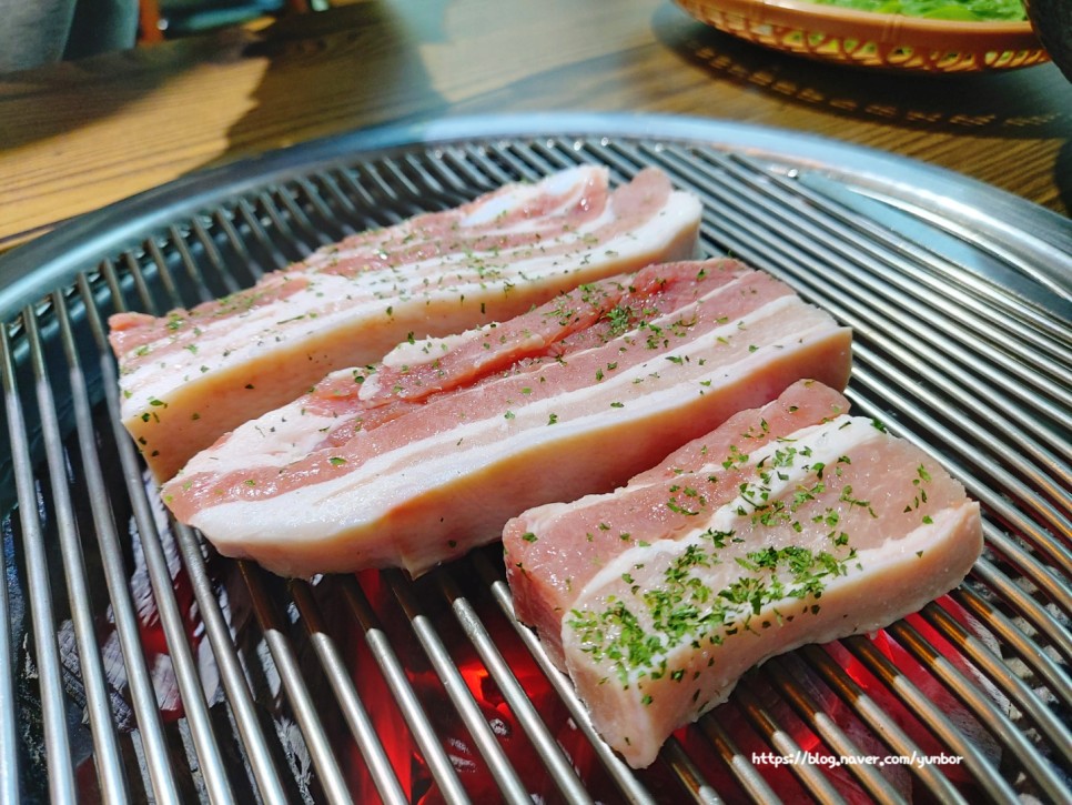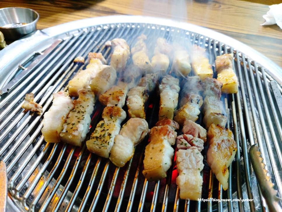 두툼하고 쫄깃한 제주생고기 참숯구이~