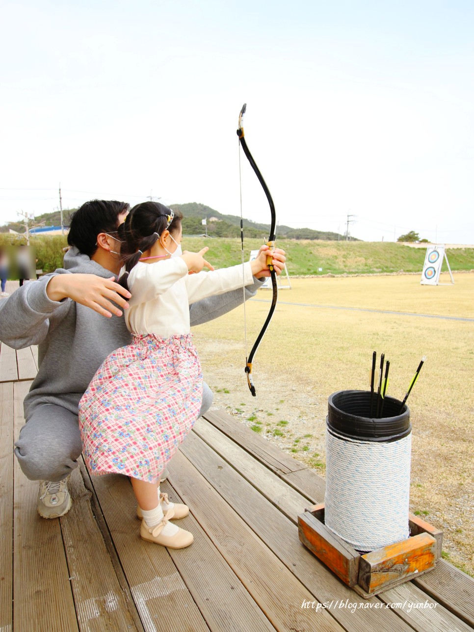 또율이는 평소에 다이소에서 산 장난감활만 쏘다가 처음으로 멋진 활을 당겨 화살을 쏴봤습니다.