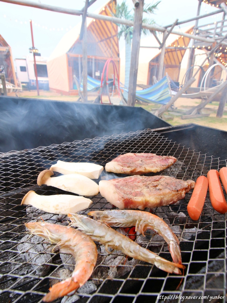 멋진 글램핑장을 바라보며 고기를 구우니 행복지수가 마구 올라갑니다.