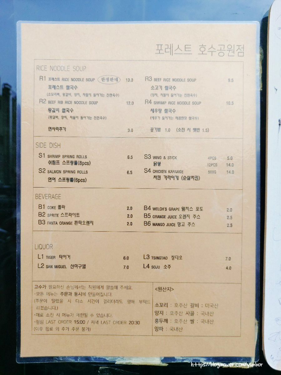 포레스트 호수공원점 메뉴판입니다.