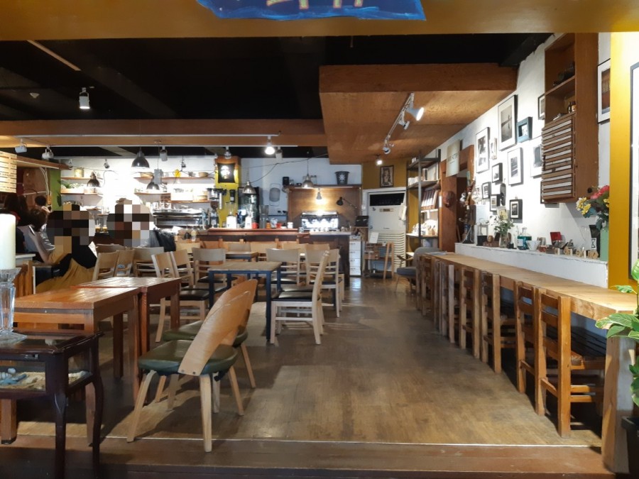 이날 날씨가 좋아서 대부분의 사람들이 실외 자리에 앉아 내부는 비교적 자리가 많이 있었다.