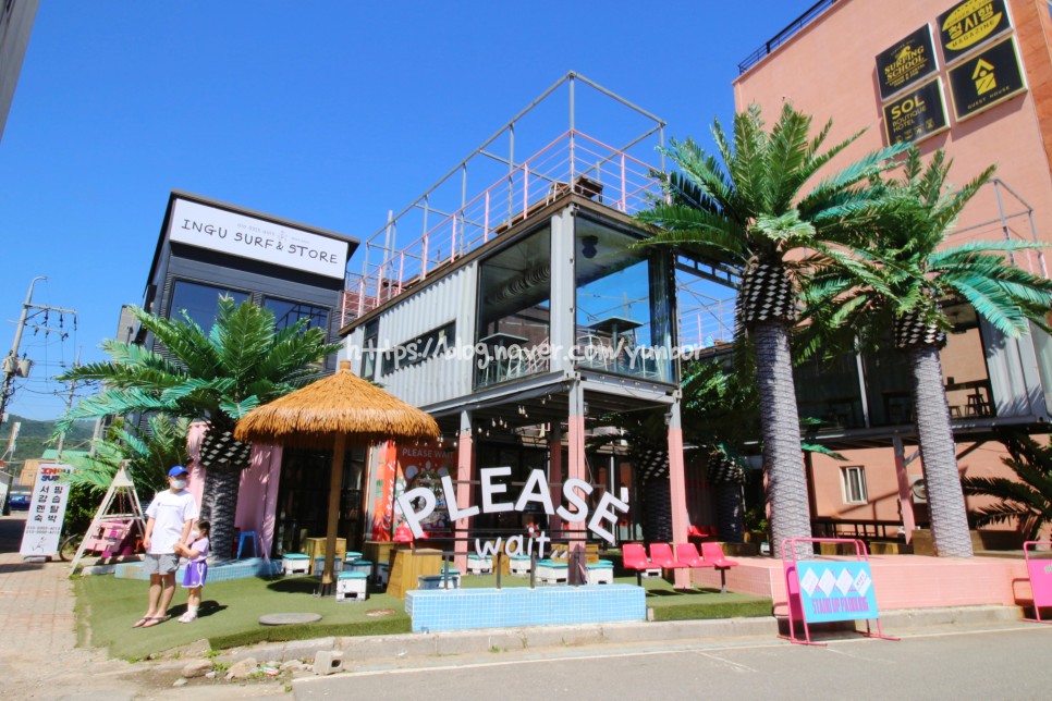 인구해수욕장 앞을 걸어보면 그 중 단연 눈에 띄는 곳 , 유명한 양양 플리즈웨잇이 보입니다.