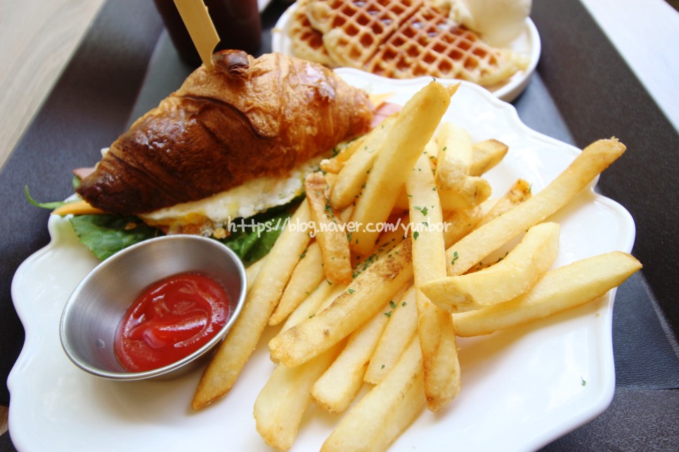 로메인, 루꼴라, 수제햄, 치즈, 계란후라이가 들어간 크루아상 샌드위치와 감자튀김!