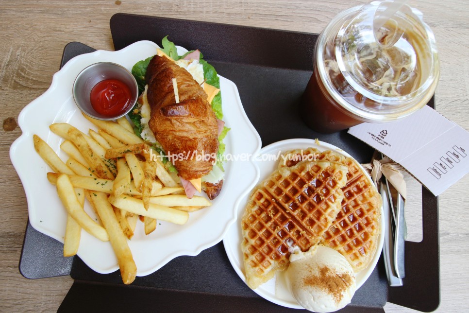 '크루아상 샌드위치 + 감자튀김'과 아이스크림이 올라간 '크로플'을 주문했습니다.