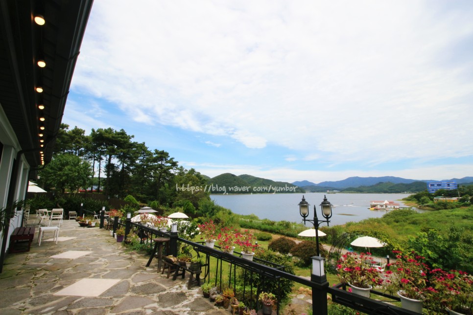 실내 자리를 지나서 실외자리로 가면 이렇게 멋진 이동저수지 뷰를 볼 수 있습니다.