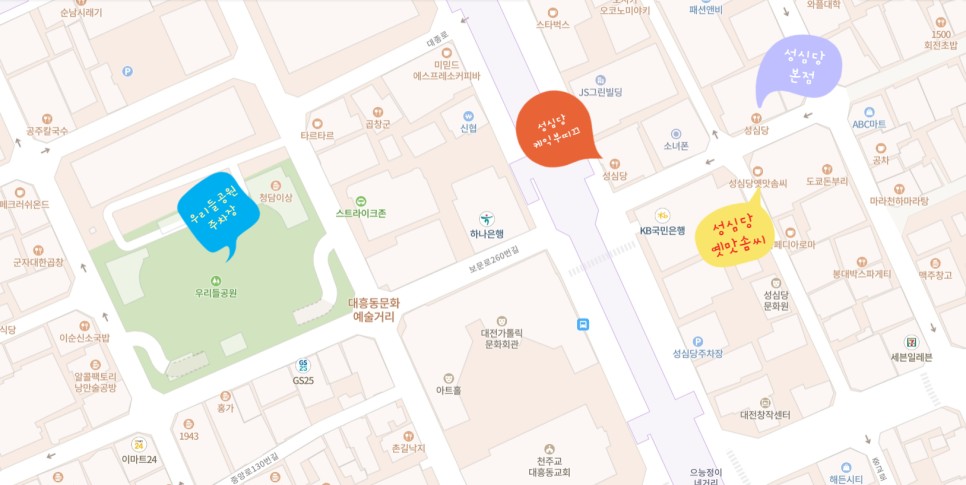 대전 성심당은 본점, 케이부띠끄, 옛맛솜씨가 함께 모여있습니다.