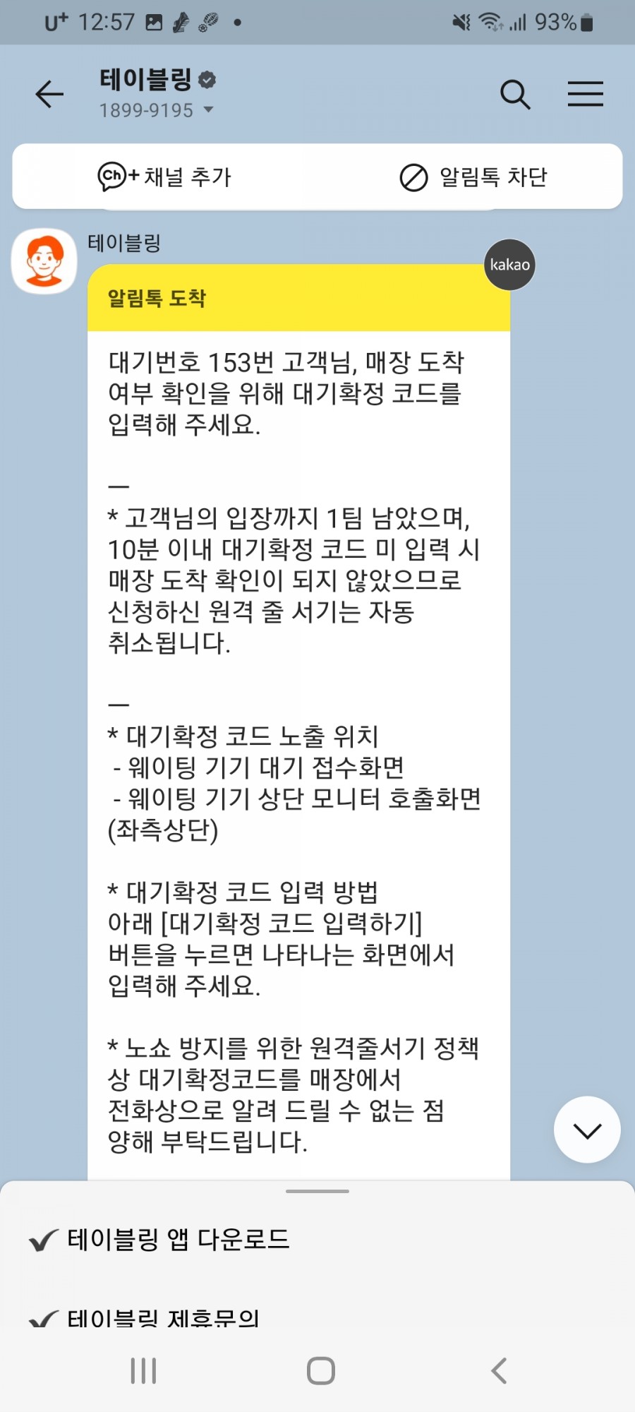 테이블링에서 대기확정코드를 입력하고 잠시 기다리면