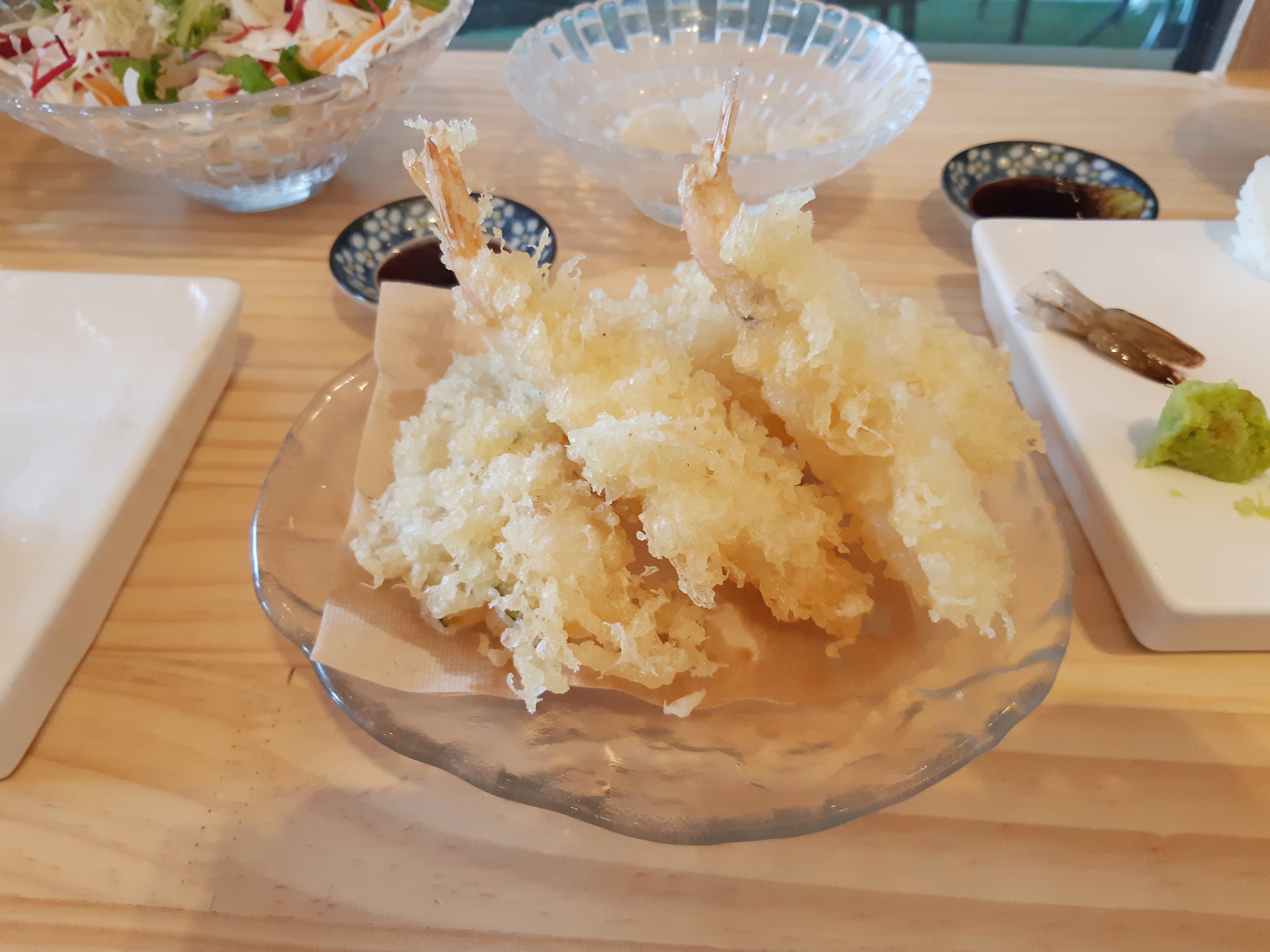 샐러드 + 장국 + 우동 + 새우튀김 + 단호박튀김 + 광어2 + 광어지느러미 + 묵은지광어